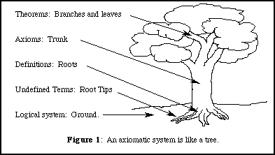 Let us compare an axiomatic system to a tree. (See FIGURE 1) First, there must be a logical system that allows us to make inferences. That is, we must have some way to decide on the truth of statements based on the truth of other statements. The logical system is like the ground in which a tree is planted. While the ground is not actually part of the tree, it is necessary in order for the tree to be planted and to grow.