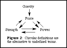 Now it is easy to understand why we must define terms carefully, but it may not be as obvious why we must include undefined terms. Suppose, for example, that we want to define "gravity". If you look up "gravity" in the dictionary, it says something like "gravity is a force that pulls things together." So, in order to understand gravity, we need to know what a force is. If you look up "force", you will find that "force" means "strength or power", so you need to look up these words as well. "Strength" means "to be strong." This is a circular definition, since the words "strength" and "strong" are essentially the same word. We also find that "strength" means "force", another circular reference, or "power". "Power", we are not surprised to learn, means "force", or "strength", precisely the words that we were trying to define in the first place. It is clear that if we try to define everything, that eventually the process must end with circular references. (See FIGURE 2) The alternative is to recognize that the basic terms of any system must be undefined. For example, we could have a system in which "force" is undefined. Then we could define "gravity" as a force, and tell how strong the force is, and on what objects it acts, etc. As another example, in Euclidean geometry we typically take "point" and "line" as undefined terms of the system. This does not mean that we cannot try to define these terms in terms of other constructs, but only that the most basic terms of the system must necessarily be undefined.