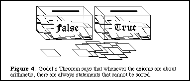 Finally, if it is possible to sort all the possible statements of an axiomatic system into "true" or "false" boxes, then the system is said to be complete. One of the most startling mathematical results of this century, known as Gödel's theorem, is that no axiomatic system for arithmetic can be both consistent and complete. In other words, when the sorting is all done (if such a thing were possible) there would always be statements about arithmetic that are left over. These statements cannot be proved either true or false. They are undecidable within that system. (See FIGURE 4).